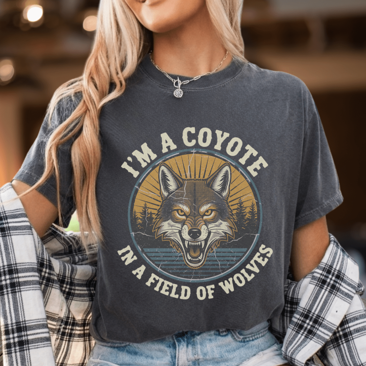 Sunset behind a coyote that doesn't run with the pack — this retro weathered graphic captures the outlaw spirit of one of the best tracks on I'm The Problem, on a tee that looks and feels like it's already been through a few good summers.