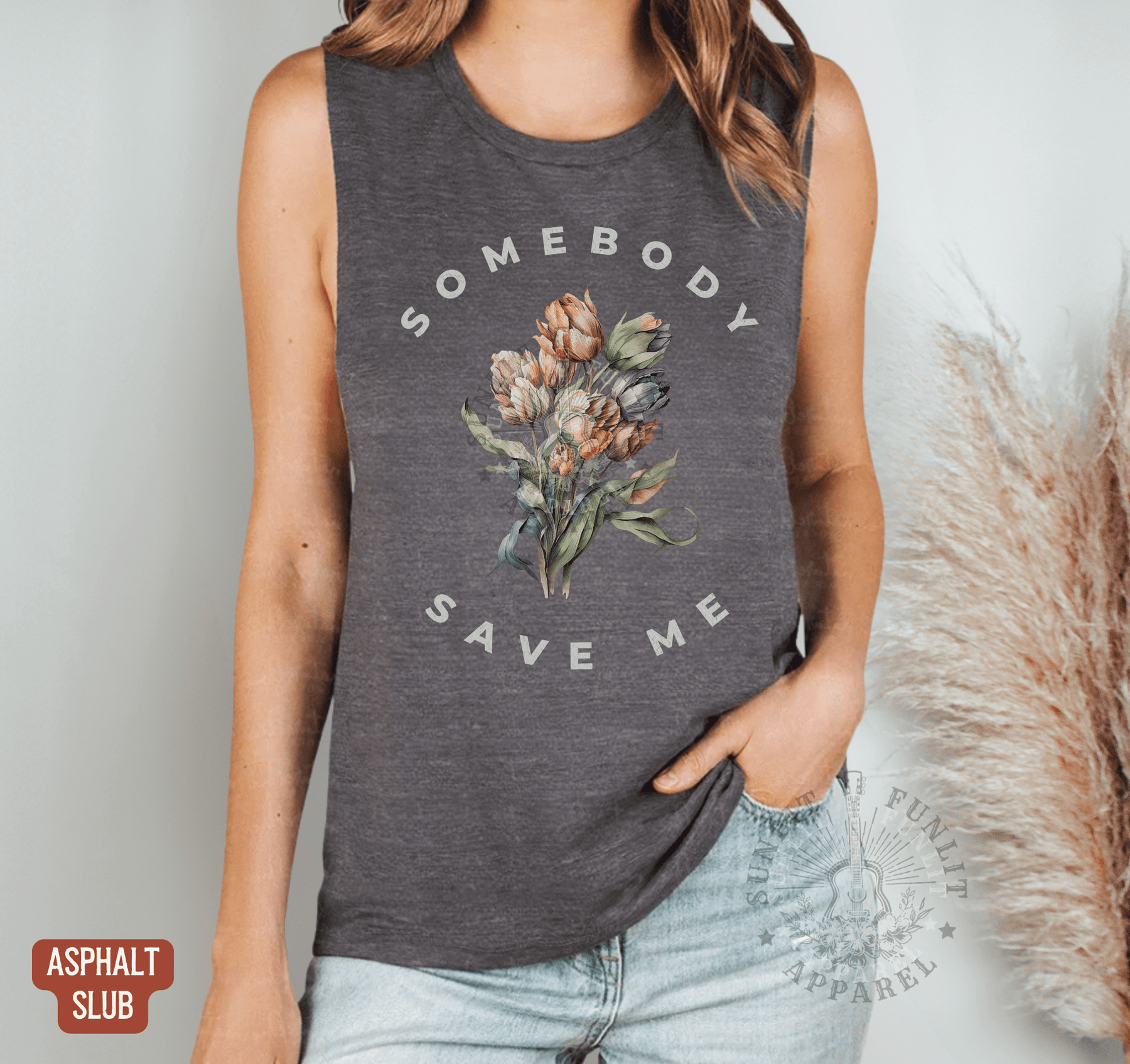 Somebody Save Me Floral Muscle Tank - Country Concert Tank Top - Sunlit Funlit | Graphic Tees for Country Concert Addicts