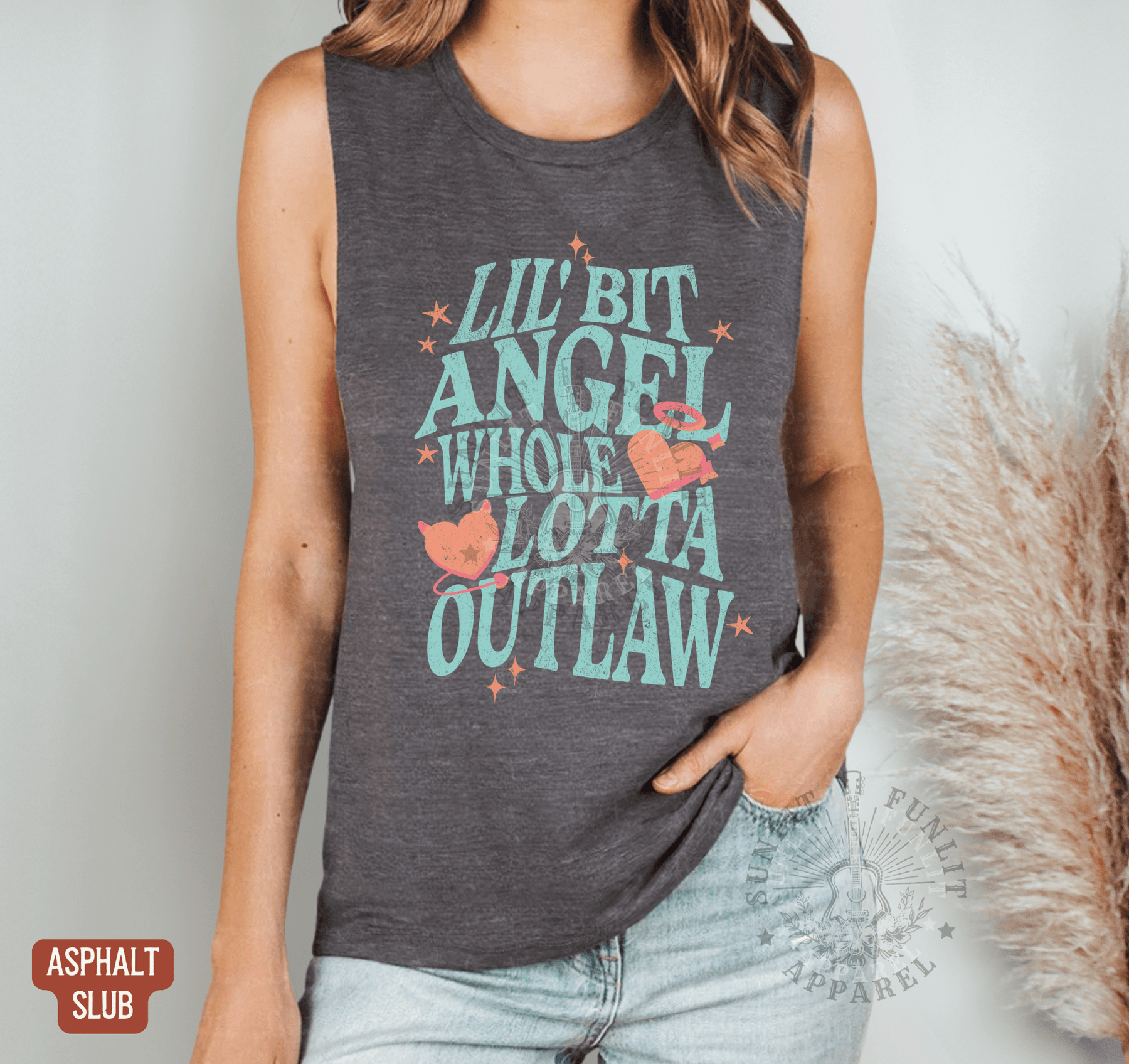 Lil Bit Angel Whole Lotta Outlaw Muscle Tank - Wallen Concert Tank Top - Sunlit Funlit | Graphic Tees for Country Concert Addicts