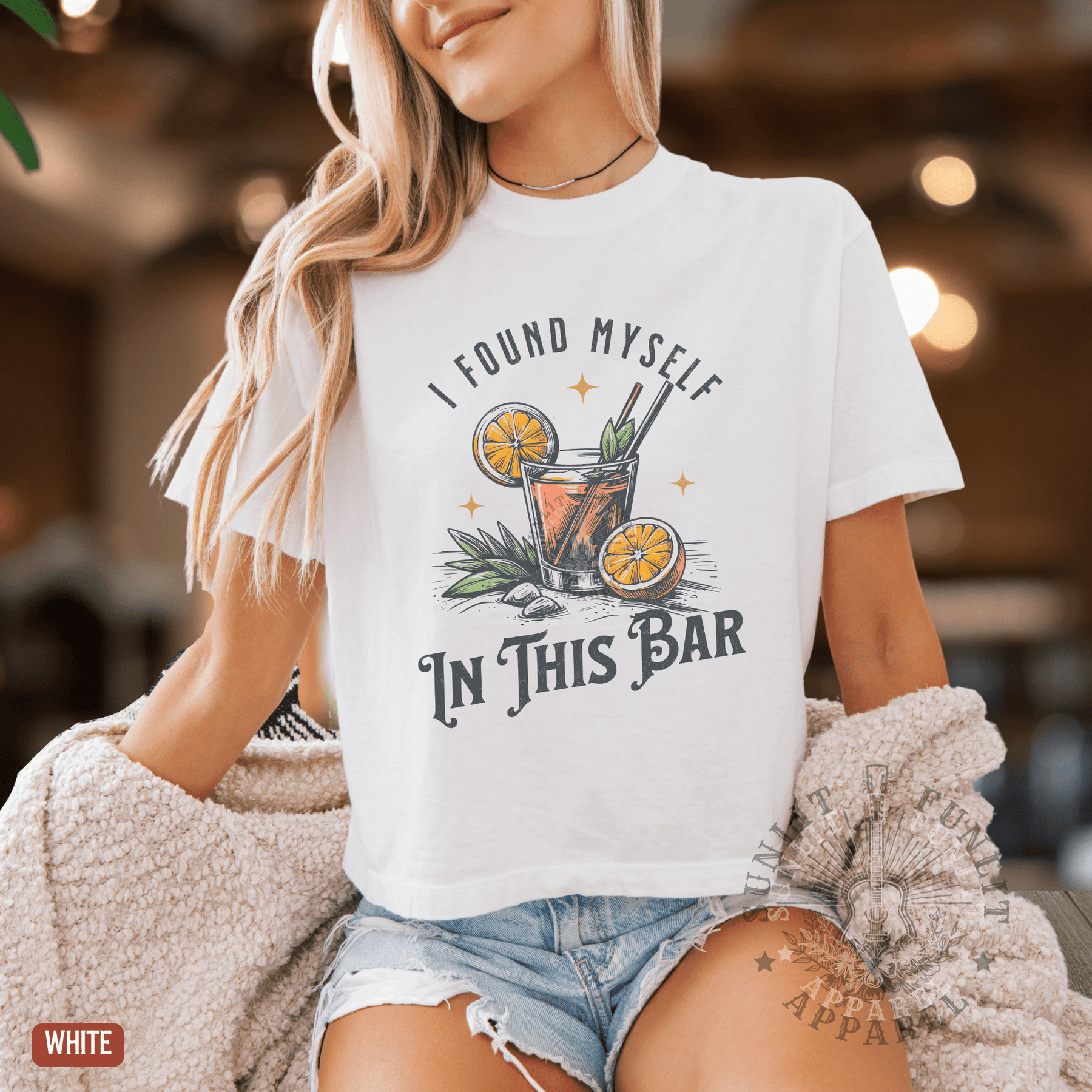 A woman wearing a white t-shirt with a graphic design of a cocktail and the text "I FOUND MYself IN THIS BAR" printed on it.