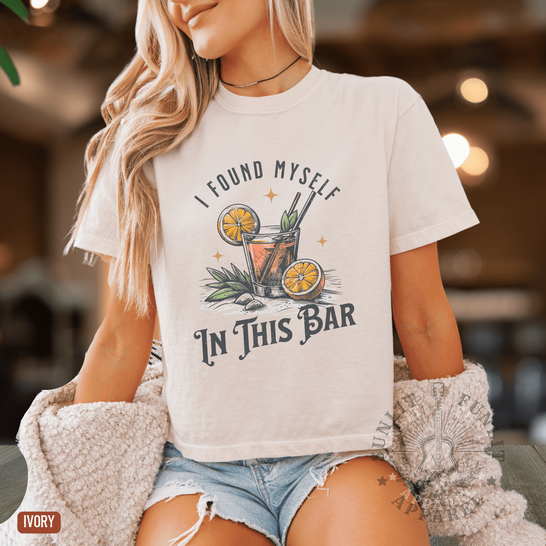 A woman wearing a pink t-shirt with a graphic design of a cocktail and the text "I FOUND MYself IN THIS BAR" is shown in the image.