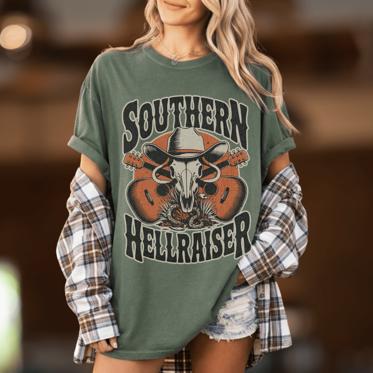 The Southern Hellraiser tee is for the girl who turns heads at the Wallen show and knows every word before the first chorus drops. Printed on a garment-dyed Comfort Colors tee, it's that perfect broken-in feel — soft, relaxed, and made to be worn all summer long.